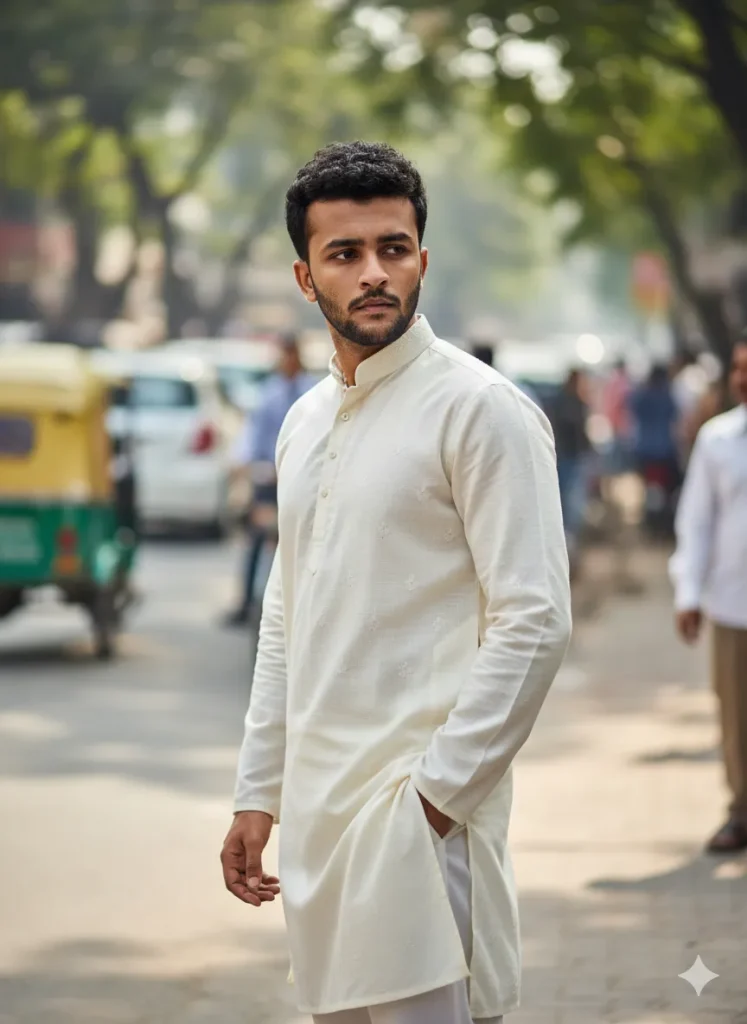Prompt: “A young man wearing a traditional white pajama and stylish Punjabi, standing with one hand in his pocket, looking sideways with a serious expression. The background shows a busy street with cars, but the background is blurred (bokeh effect) to keep full focus on the man. Natural daylight, cinematic photography, sharp details on the outfit, soft shadows, professional lens effect, elegant posture, realistic high-quality image.”