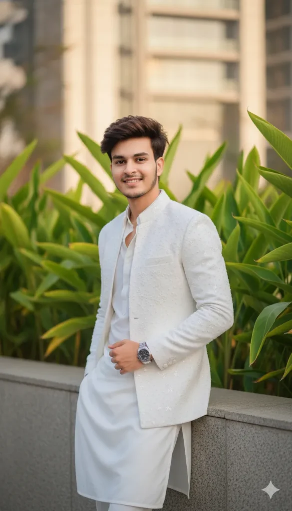 Prompt: “”Full-body, ultra-photorealistic portrait of a stylish, confident man, using the uploaded reference photo to keep the exact face and perfectly set hairstyle, facing the camera. He wears a modern all-white Indo-western outfit with subtle bead and sequin details on the jacket and kurta-style top, slightly open at the chest. Leaning slightly forward with elbows bent, hands loosely clasped in front, light stubble, sleek wristwatch. Standing reliably.”