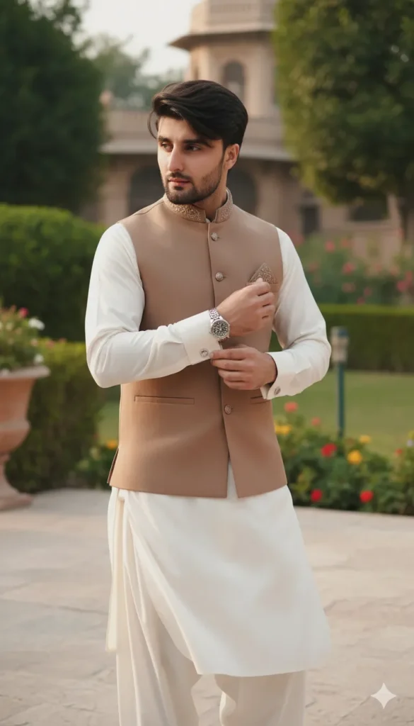 Prompt: “Create a high-fashion outdoor portrait of me using the exact same face from the reference image, no changes or alterations. I wear a tailored off-white Shalwar Kameez with a light brown waistcoat, subtle embroidery on edges, and polished cufflinks with a natural gleam. Fabric and waistcoat show gentle, lifelike motion. The casually standing pose is elegant and dynamic adjusting cufflinks with one hand. the other relaxed by my side, slight torso twist, subtle weight shift on one leg, shoulders relaxed, gaze to the side.