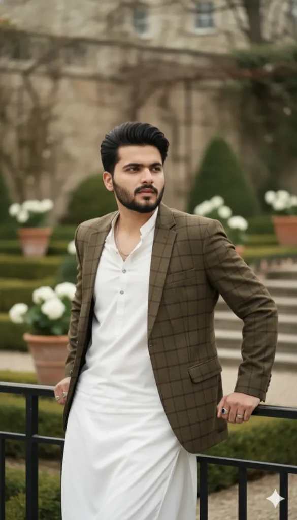 Prompt: “A hyper realistic photo of a man wearing an off chocolate shalwar kameez with an olive chocolate color check blazer, casually leaning on an iron garden railing. Around him, European-style greenery and rustic textures create a minimal but royal aura. The daylight is soft, producing a calm and balanced scene with pastel color tones and cinematic shadows. Captured in 4K resolution, elegant and professional. The face is 100% same as in the reference.”