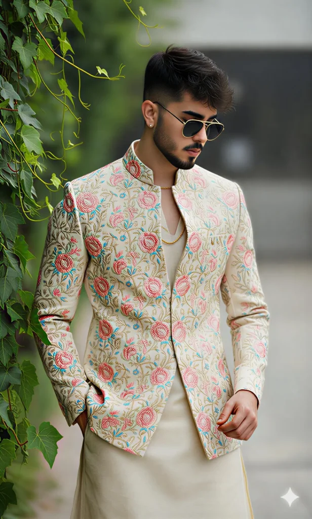 Prompt: “A stylish man (use reference face 100%) in traditional Indian attire, standing outdoors with a subtle background. He is wearing a cream-colored bandh gala jacket with intricate pink and blue floral embroidery, over a matching short kurta and trousers. He is wearing sunglasses and has a gold chain around his neck. His left hand is casually in his pocket, and there’s subtle mehndi on his right hand. A vine of greenery is visible on the left side of the frame.”